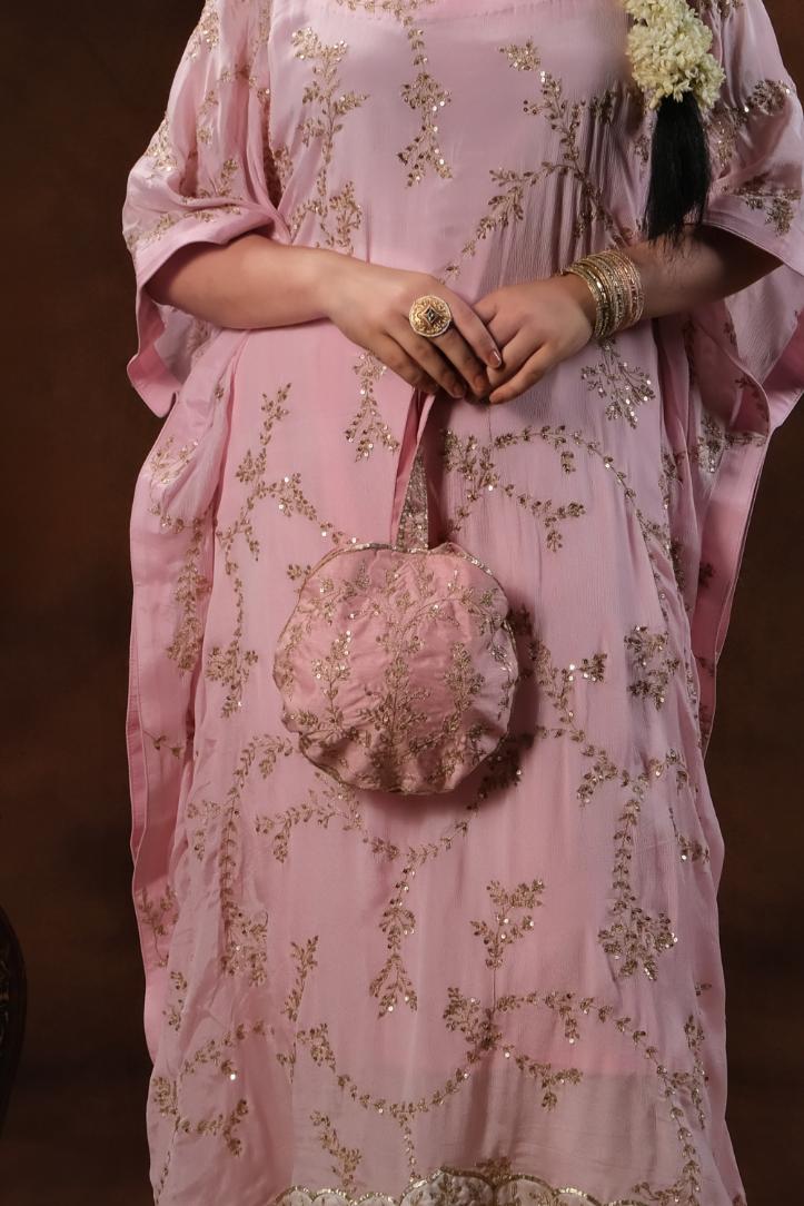 Soft as a whisper and adorned with intricate handwork, this blush pink kaftan in chinnon chiffon captures feminine grace in its purest form. Paired with structured raw silk pants for balance, it's a look that moves effortlessly from pre-wedding rituals to festive celebrations, ethereal, elegant, and timeless.