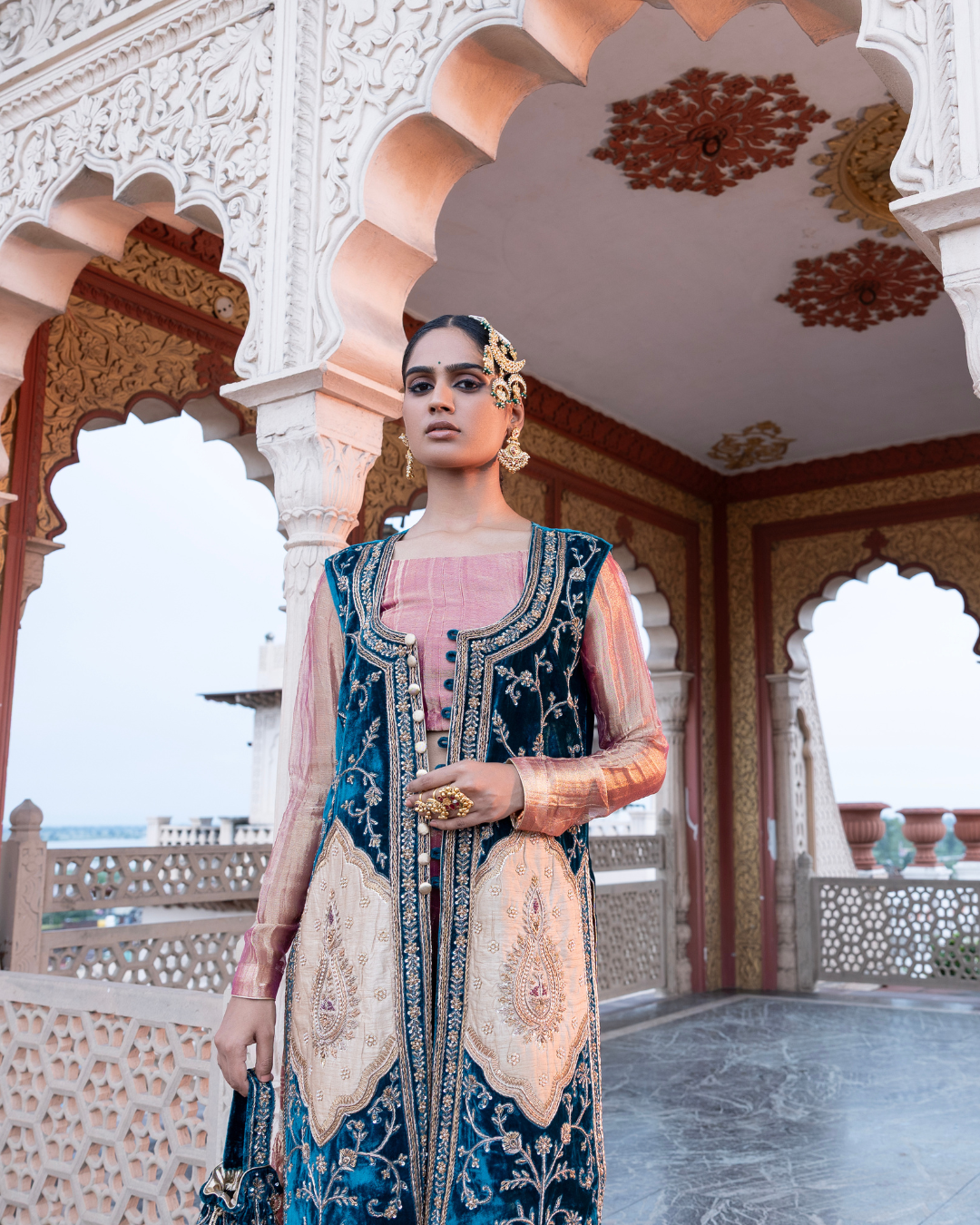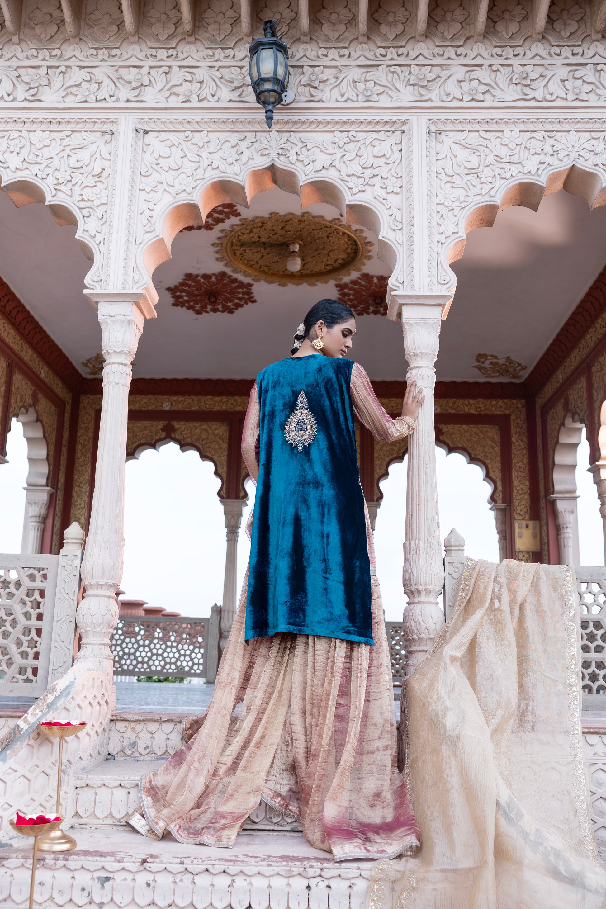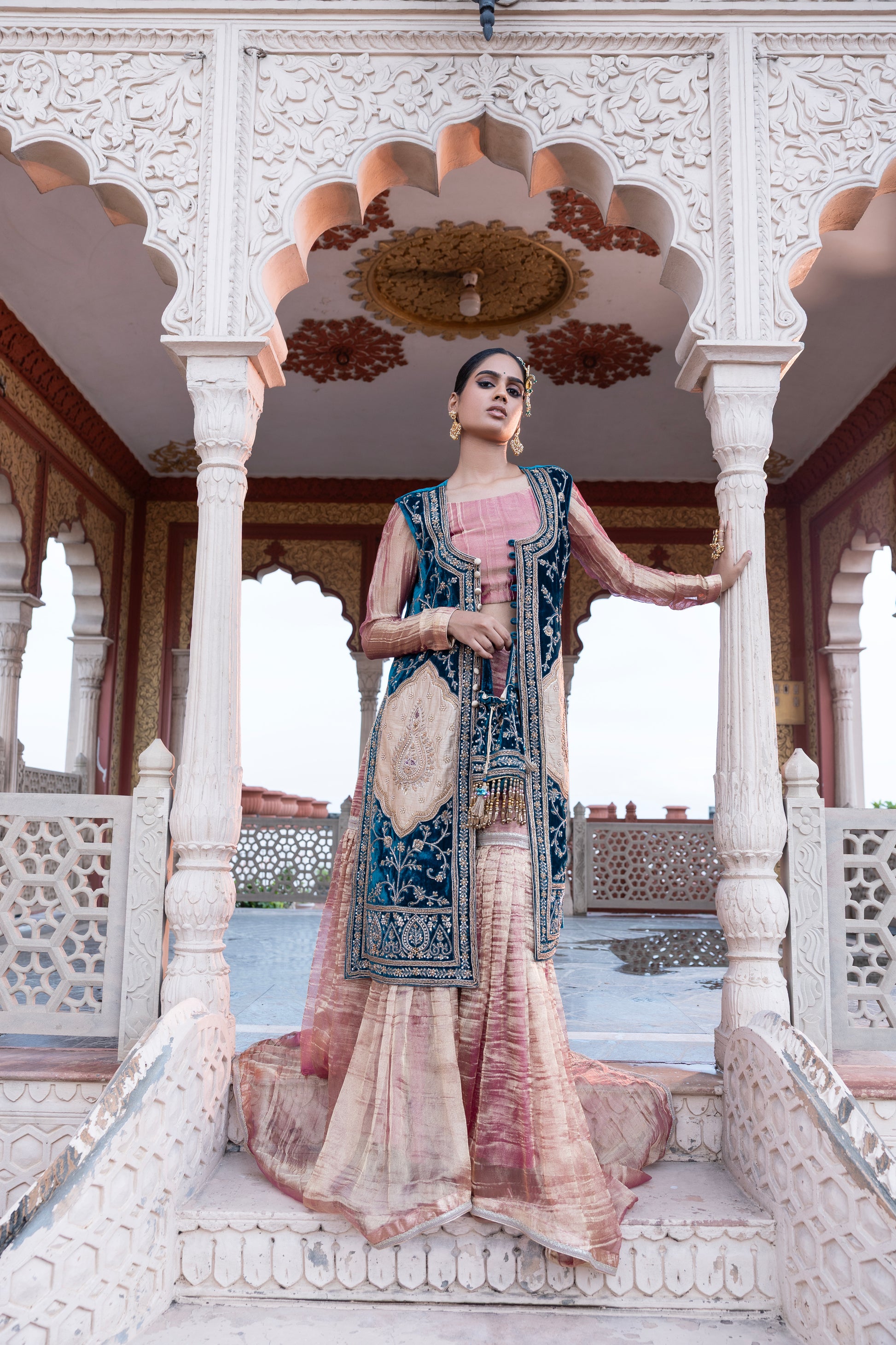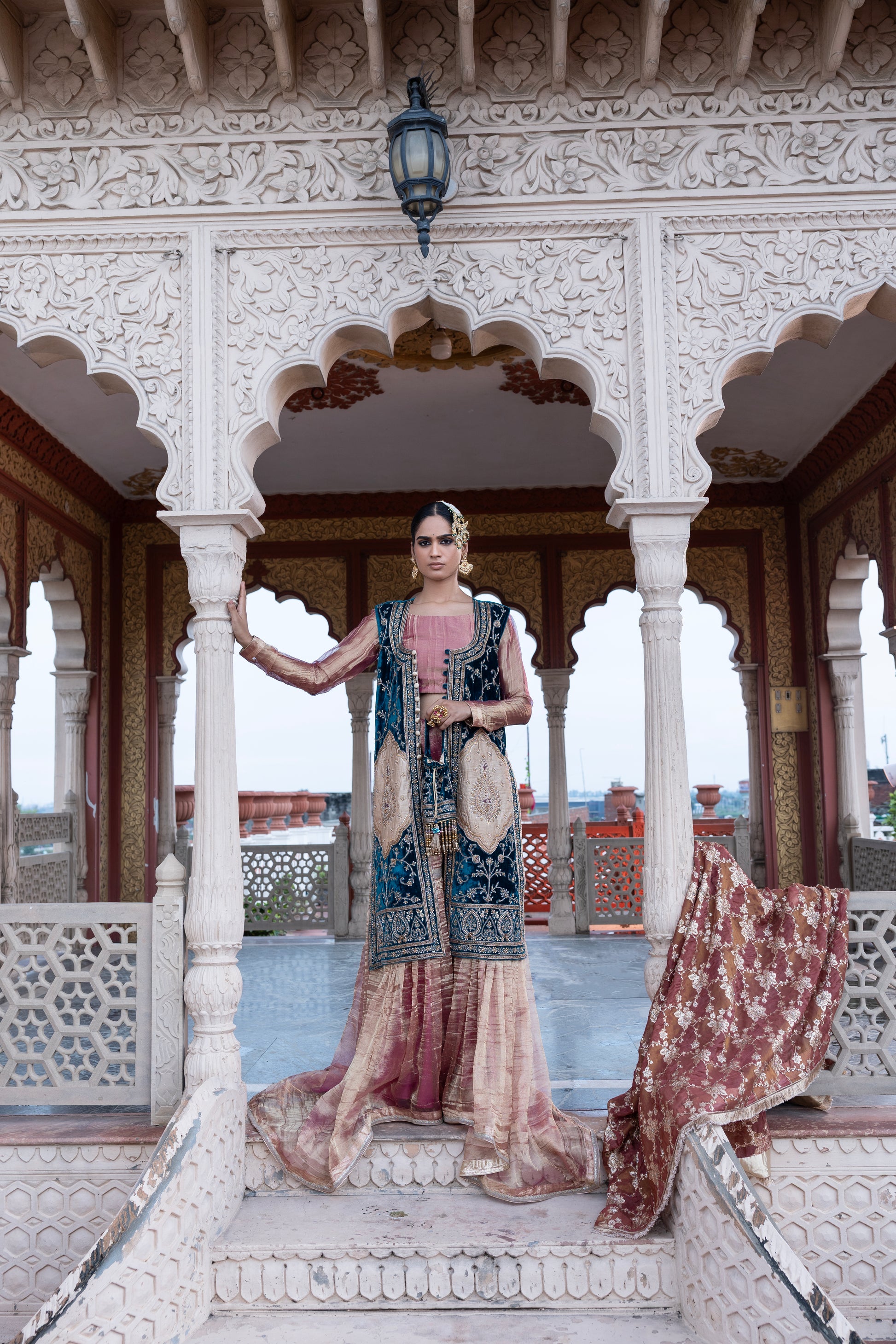 The deep blue velvet jacket with intricate zardozi, dori, and jaali embroidery. The main panels have elaborate beige and gold threadwork, and the borders showcase floral and paisley motifs. It comes with a sheer pink-beige top, designed with delicate pleats and hand smocking for added texture. The farshi gharara made from crush tissue fabric, displaying a hand tie-dye effect in shades of soft pink and off-white.